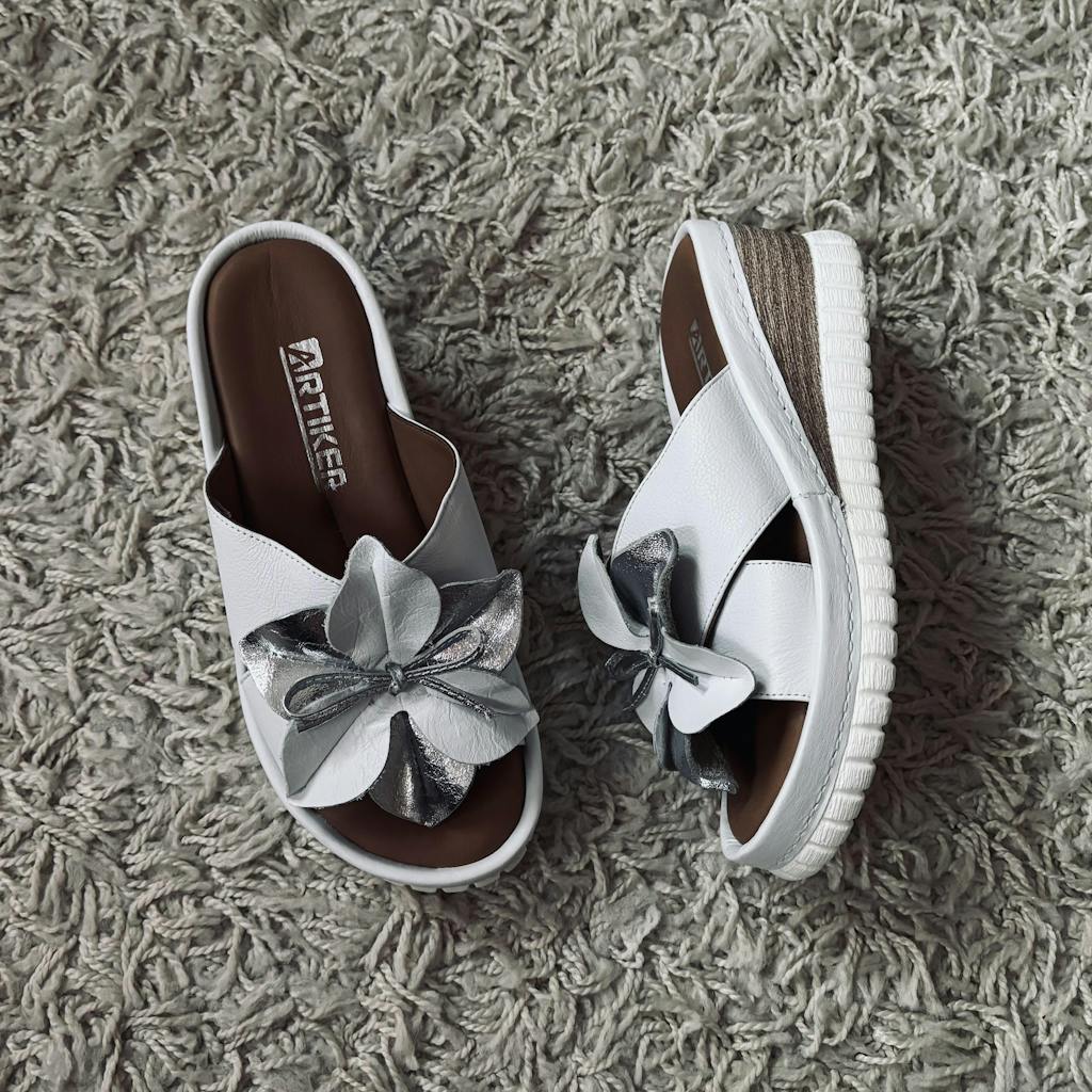 Damenpantoletten aus hochwertigem echtem Leder gefertigt. Auf einer Keilabsatz platziert. An der Vorderseite des Schuhs befindet sich eine dezente dekorative Blume, die ihm einen besonderen Charakter verleiht. Die sehr weiche Einlegesohle sorgt für Komfort den ganzen Tag über und macht diese Pantoletten zu einer idealen Wahl für Sommerstylings, die Funktionalität mit modischem Aussehen verbinden.
